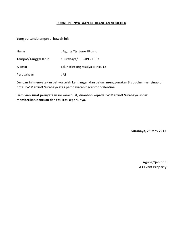 Jadi selalu pastikan bahwa isi yang ada di dalam surat adalah hal yang sebenarnya sesuai dengan fakta yang ada dan juga pastikan memakai bahasa yang resmi dan sopan. The collection that comprising chosen picture and the best amongst others. Setelah dokumen tersebut hilang, maka mau tidak mau anda harus mengurusnya kembali agar bisa mendapatkan dokumen penggantinya. Surat pernyataan kehilangan ini saya buat pada hari senin tanggal 19 april 2017 bertempat di rumah saya. Dalam arti lain surat ini diartikan sebagai pernyataan secara tertulis tentang kesanggupan kesediaan seseorang atau kelompok untuk menjalankan sesuatu yang telah disepakati dalam surat.