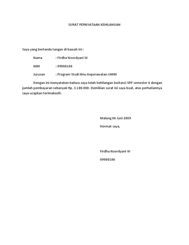Surat pernyataan kehilangan yang bertanda tangan dibawah ini, nama : Surat pernyataan kehilangan ini saya buat pada hari senin tanggal 19 april 2017 bertempat di rumah saya. Pengembangan produk no hp aktif : Try the suggestions below or type a new query above. Tandai sebagai konten tidak pantas.